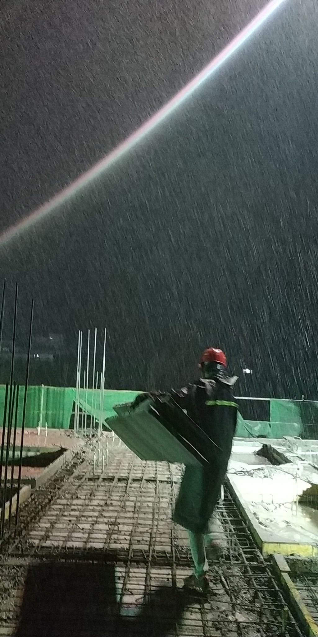 11月7日鎮(zhèn)雄縣第二人民醫(yī)院項目迎來了2018年的第一場雪,這是一個雷電、雨、雪交加的晚上,給人的感覺身處在一個偌大的冰窖里,我窩在被窩里抱著火爐看電視。然而在如此寒冷上廁所都需要勇氣的夜晚,為了確保完成11月30日節(jié)點目標(biāo),我們的項目副經(jīng)理成俊、施工員胡杰盛和民工兄弟們,冒著雷雨雪依然堅守在澆筑混凝土的第一線。在寒冷的冬季,如何保證澆筑的混凝土質(zhì)量是一大難題,在質(zhì)量總監(jiān)劉榮軍的指導(dǎo)下對混凝土成品采取防凍防寒措施,第一層采用薄膜覆蓋、第二層用土工布鋪蓋、第三層用防水黑棉鋪蓋、第四層用土工布覆蓋壓實,澆筑完后用兩盞三千瓦燈對射覆蓋。