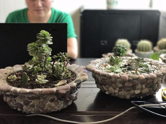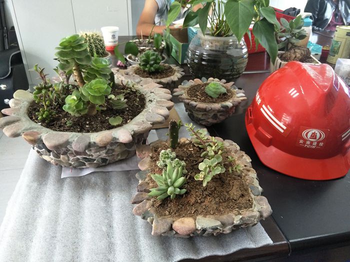 技術(shù)支持: 方森科技 今天晚飯時(shí)經(jīng)過材料室,無意間發(fā)現(xiàn)袁老師傅和小尤拿著一桶小石子和小半袋水泥在那搗鼓著什么,仔細(xì)一看,眼前的一幕讓我眼前一亮,只見他們一人拿著小鏟子兌著水?dāng)嚢杷?,一人在塑料盒周圍擺上小石子,不一會(huì)兒的功夫,一個(gè)個(gè)漂亮的小花盆閃亮登場(chǎng)啦。別說,這用塑料盒、水泥和小石子做出來的花盆還真是漂亮,再放上泥土,種上多肉植物,擺放在辦公桌上,真是這繁忙的項(xiàng)目駐地處里的“一股清流”啊。細(xì)問才知道,原來,這些漂亮花盆的材料都是“原生態(tài)”來的,塑料盒是吃完洗干凈的塑料飯盒,水泥是他們?cè)谒嘬囆敦浀臅r(shí)候掃下來的水泥渣,就連小石子也都是從澄江邊上撿回來的。利用這些材料,袁老師傅和小尤親手“打造”出了辦公室里的一道靚麗的風(fēng)景。