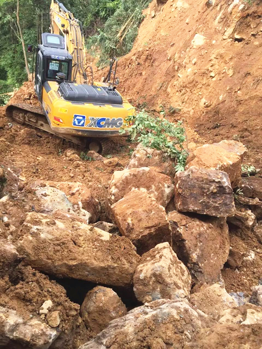 7月13日早7點(diǎn),響徹云霄的鞭炮聲過后,所有機(jī)械開始作業(yè)。挖掘機(jī)工作7小時推進(jìn)到6米的時候,山體出現(xiàn)了滑坡,好在提前做了排險處理,未出現(xiàn)任何施工事故。道路基線均處在滑坡地帶、山體內(nèi)所含石料60%為整石、40%為孤石含雜松軟黏土,這為施工帶來了很大難度,工作進(jìn)度也非常緩慢,到了晚上22點(diǎn),道路才勉強(qiáng)推進(jìn)到9米。