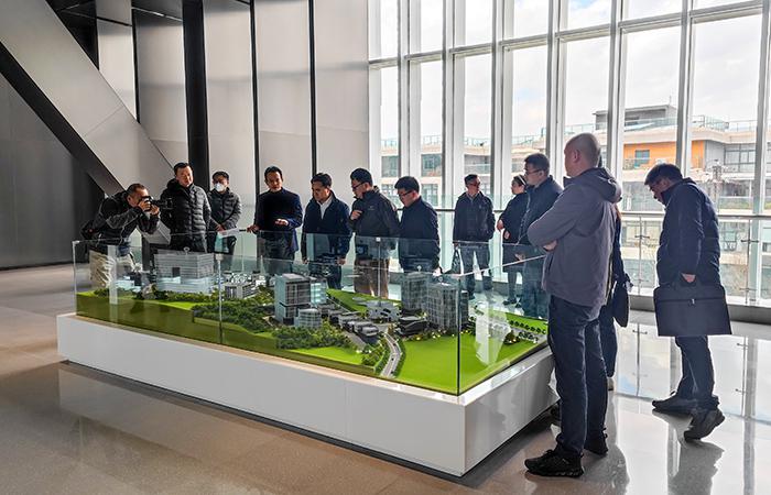 陳江一行來到項目2棟招商引資展示廳和4棟樣板施工現(xiàn)場,聽取項目介紹,充分肯定了項目施工進度、質量、安全、經(jīng)濟、安全文明管理成績。
