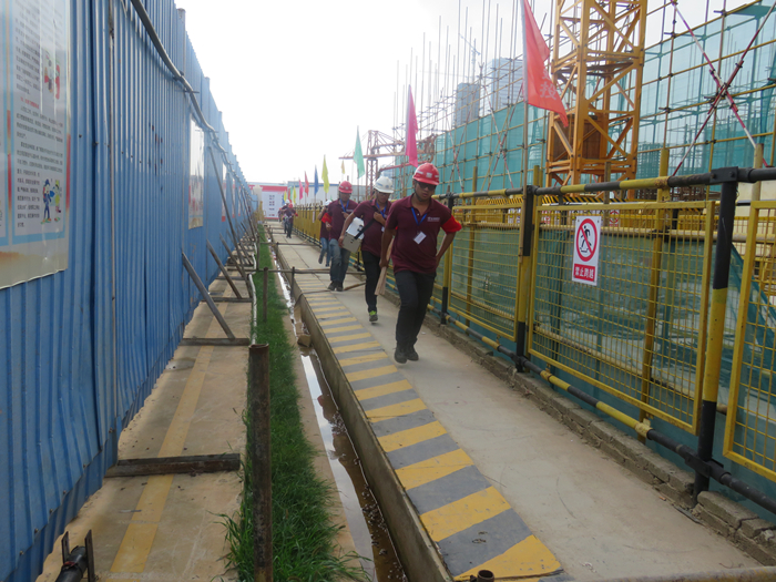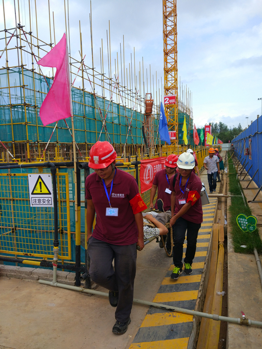 項目部應(yīng)急救援小組依據(jù)事故類型,假設(shè)施工人員意外從高處墜落的事故發(fā)生現(xiàn)場,根據(jù)應(yīng)急救援方案,進行了流程內(nèi)容演練:管理人員在第一時間得知情況后即快速反應(yīng),救援組、疏導(dǎo)組、調(diào)查組、通訊組及后勤保障等人員各司其職迅速趕往現(xiàn)場,正確判斷險情,救助現(xiàn)場“受傷工人”,同時拉起禁戒線、通知120急救人員。整個救援演練現(xiàn)場井然有序,各組人員行動迅速及時。本次演練旨在,增強現(xiàn)場施工人員安全生產(chǎn)意識,檢驗安全預(yù)案的可操作性,提高一線管理人員處理安全事故的能力。