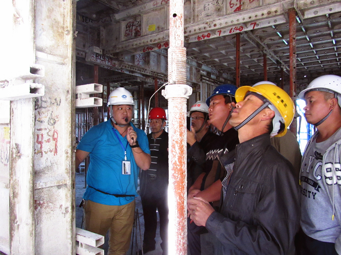 活動中,龍潤園項目的執(zhí)行項目經(jīng)理及項目總工通過ppt演示的方式對整個項目的亮點、特色及基本運行情況做了介紹。隨后,觀摩組參觀了工序樣板區(qū)、現(xiàn)場在用鋁模、爬架及部分現(xiàn)場棟號,執(zhí)行項目經(jīng)理對工程的質(zhì)量通病整治控制做了全面闡述。