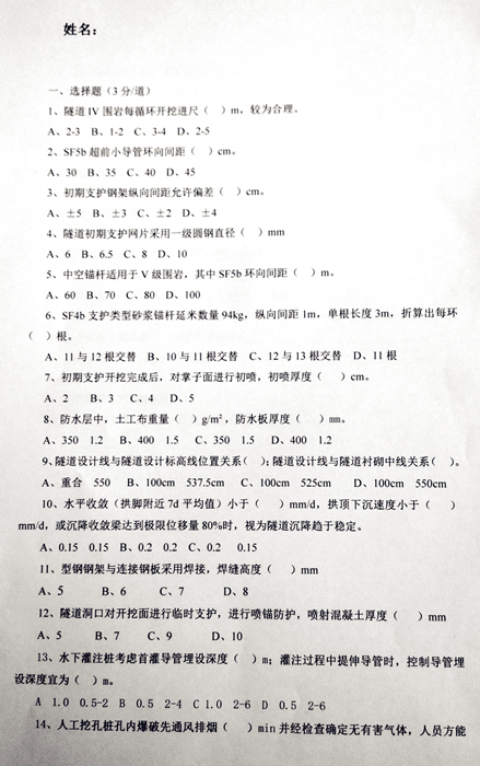 考試針對施工環(huán)節(jié)中易忽視的問題,重點(diǎn)考察了橋梁、隧道的規(guī)范及施工工藝,并采取圖紙與規(guī)范相結(jié)合的方式梳理了整個(gè)工程項(xiàng)目的施工概況。其中,隧道考察范圍包括:圍巖類型、超前預(yù)報(bào)、支護(hù)、安全、質(zhì)量等;橋梁考察范圍包括:調(diào)拱、調(diào)坡、平整度和壓實(shí)度的控制,特別考核了樁基施工中的主控項(xiàng)目指標(biāo)。