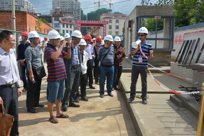 會前,來自玉溪市八縣一區(qū)質(zhì)監(jiān)系統(tǒng)的相關(guān)人員參觀了正在施工的工地現(xiàn)場,了解了項目部在質(zhì)量通病治理的相關(guān)措施,重點學習了項目工序樣板區(qū)、鋁合金模板的使用情況和成效。