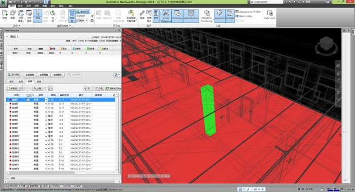 在集團組建了BIM工作站后,公司技術中心按照要求于2014年4月正式成立了BIM工作室,目前建模人員2人(土建專業(yè)1人,水電專業(yè)1人)。公司根據BIM技術運用的特點和新開項目實際,選取保山醫(yī)院門診樓項目作為首個BIM技術研究的試點工程,并于2014年5月1日開始模型繪制,至同年6月30日完成模型初稿繪制,耗時2月,分專業(yè)、分系統(tǒng)完成工程信息模型的建立,在模型碰撞檢查中發(fā)現43946個碰撞,其中真實碰撞點25000余個。