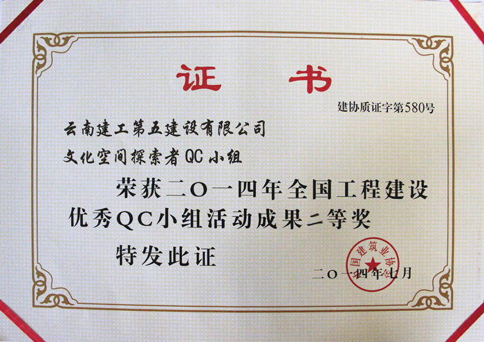 第四直管部文化空間項(xiàng)目部探索者QC小組從2012年至2013年歷時(shí)10個(gè)月時(shí)間深入地開展了針對超高層建筑高強(qiáng)度混凝土外觀質(zhì)量合格率的研究調(diào)查,并申報(bào)了QC成果,進(jìn)行了發(fā)布,最終取得“全國工程建設(shè)優(yōu)秀QC小組二等獎(jiǎng)”殊榮。