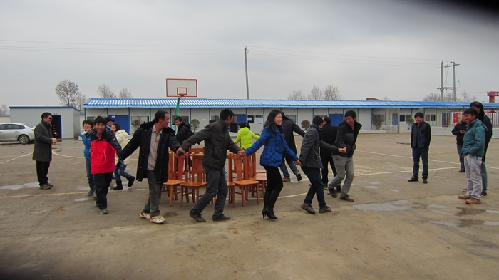 游戲分為兩個(gè)環(huán)節(jié)——“兩人三足”和“搶凳子”。“兩人三足”就是將兩個(gè)人的兩支腳綁在一起賽跑,兩人一組,每輪四組,最先到達(dá)終點(diǎn)的就算贏,經(jīng)過三輪比賽,范府和馬克海配合默契最終贏得第一名;接著是“搶凳子”,所有人站成一圈,圈內(nèi)擺好凳子,大家圍著凳子轉(zhuǎn),當(dāng)裁判喊停時(shí)未搶坐到凳子的就算輸,輸了就要表演節(jié)目。游戲現(xiàn)場緊張而激烈,吶喊聲、歡呼聲一片,雖然天氣寒冷,但大家的熱情絲毫不減。