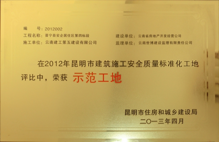 技術(shù)支持: 方森科技 近日,公司五〇三直管項(xiàng)目部承建的晉寧縣安企居住區(qū)第四標(biāo)段工程被云南建工集團(tuán)有限公司授予二〇一二年度“安全質(zhì)量標(biāo)準(zhǔn)化十佳工地”榮譽(yù)證書,另外,該工程在2012年昆明市建筑施工安全質(zhì)量標(biāo)準(zhǔn)化工地評比中,還被昆明市住房和城鄉(xiāng)建設(shè)局授予“示范工地”獎(jiǎng)牌和榮譽(yù)證書。