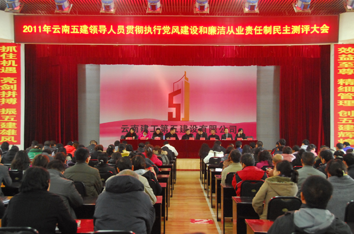 12月2日下午2時,為認真貫徹執(zhí)行黨風建設,加強群眾監(jiān)督,公司在大禮堂召開了2011年云南五建黨政領導班子成員貫徹執(zhí)行黨風建設和領導人員廉潔從業(yè)責任制民主測評大會,開展民主測評活動。公司董事長楊福和出席會議并發(fā)言。公司領導班子成員及機關支部所屬員工200余人參加。