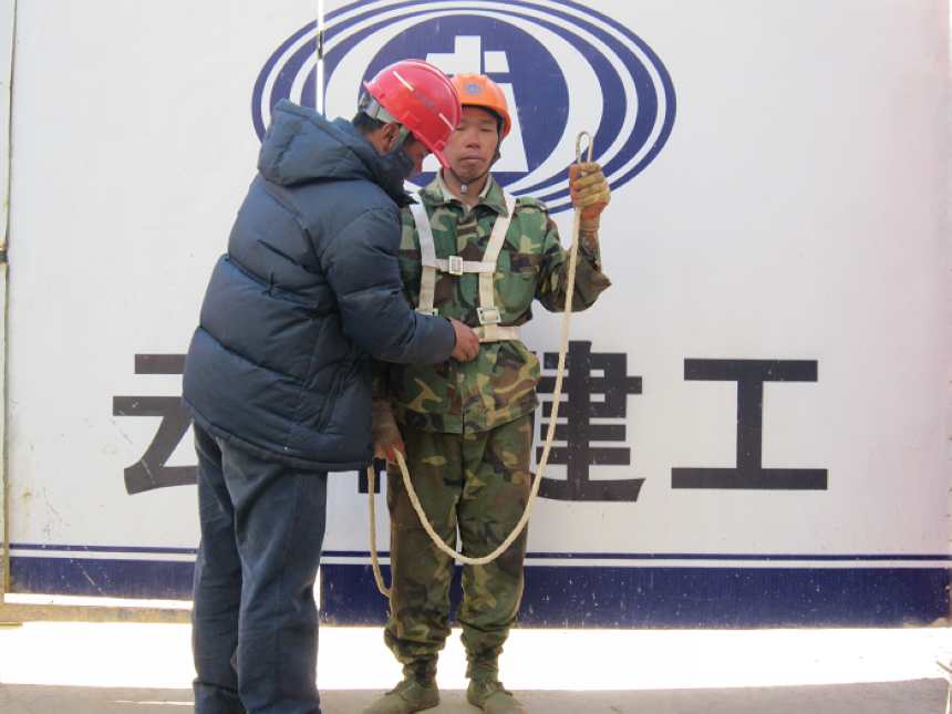 圖為項目部管理人員講解高空作業(yè)時安全繩的使用方法