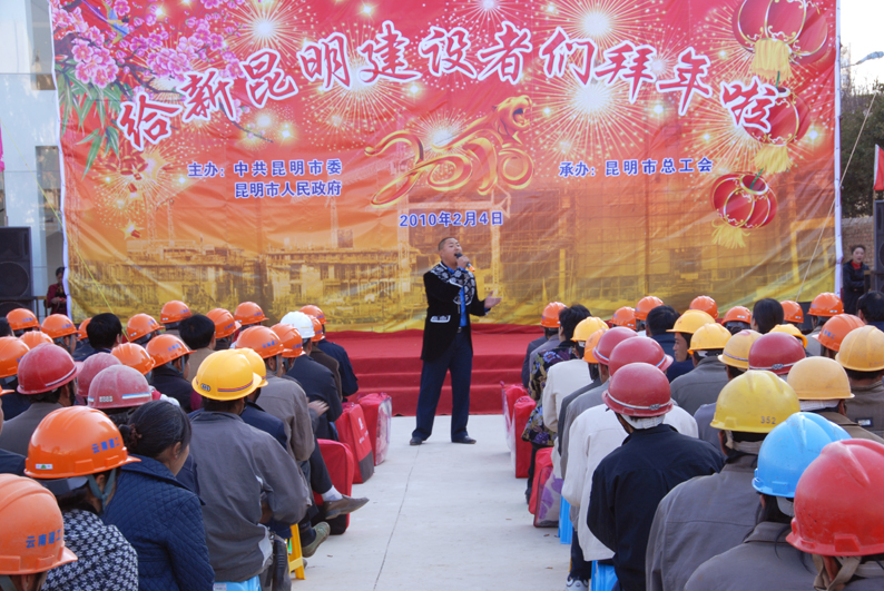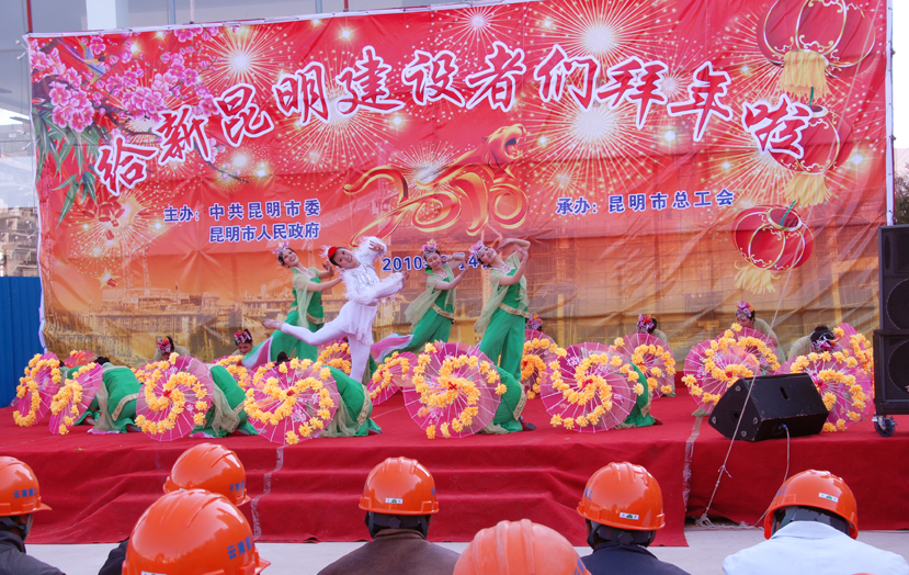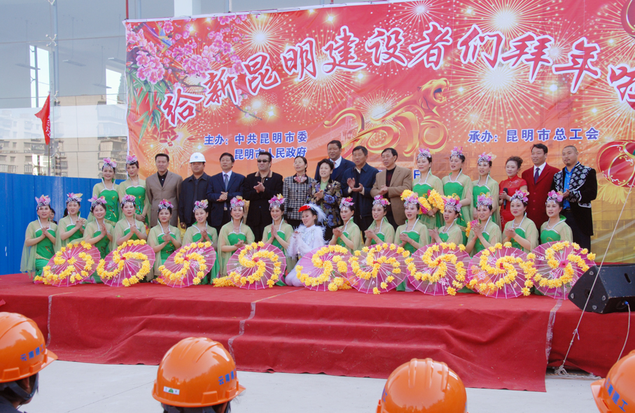 2月4日上午,受昆明市委、市政府委托,昆明市總工會(huì)主席楊麗等領(lǐng)導(dǎo)同志率團(tuán)到云南建工第五建設(shè)有限公司昆明工人文化宮建設(shè)工地,給包括農(nóng)民工在內(nèi)的新昆明建設(shè)者拜年,給建設(shè)者送來(lái)新春的祝福和溫暖的禮品。楊麗主席和工會(huì)干部以及昆明市楓葉職工藝術(shù)團(tuán)的演員們分別獻(xiàn)上精彩的歌舞。