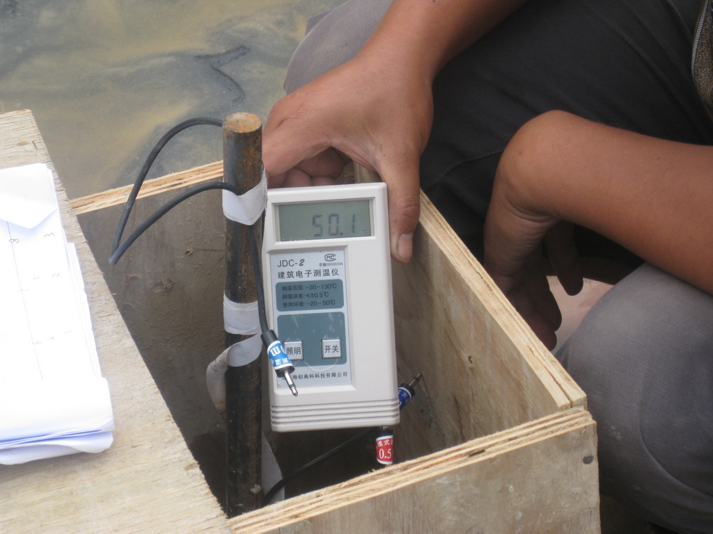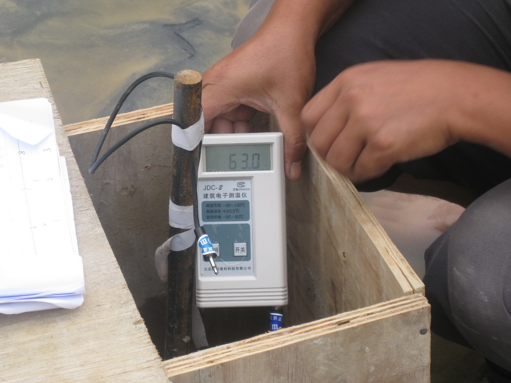根據(jù)我公司大體積混凝土施工的成功經(jīng)驗(yàn),在澆灌混凝土之前編制了基礎(chǔ)大體積混凝土施工方案,采取優(yōu)化配合比設(shè)計(jì)、設(shè)置澆筑分倉(cāng)縫,合理確定澆灌順序,保證筏板不出現(xiàn)冷縫,采用蓄水保溫養(yǎng)護(hù)法,并根據(jù)規(guī)范要求布置了7個(gè)測(cè)溫點(diǎn)。