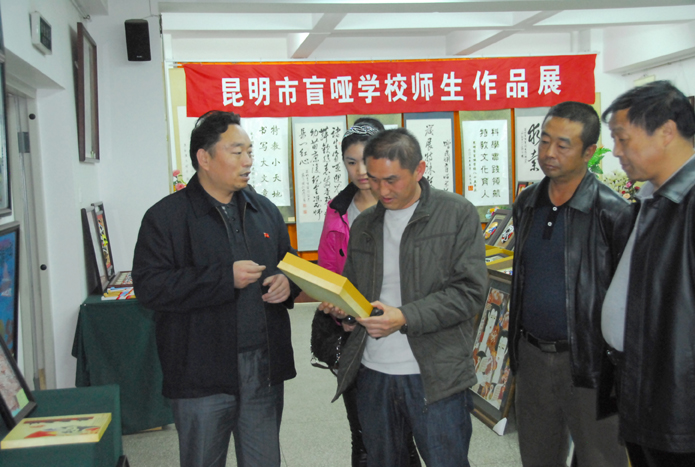 魏華(中)一行在昆明市盲啞學(xué)校校長楊志成的陪同下參觀學(xué)校師生作品