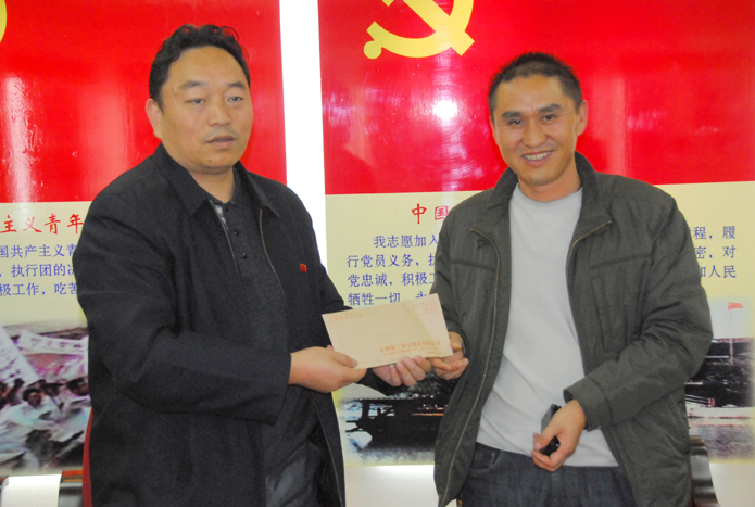 魏華(右)代表公司接受學(xué)校贈送的錦旗