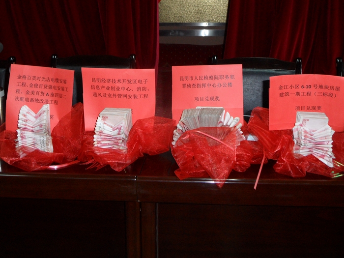 第一安裝直管部本次兌現(xiàn)的項(xiàng)目分別是:昆明市人民檢察院職務(wù)犯罪偵查指揮中心辦公樓安裝工程,兌現(xiàn)金額172407.03元;金江小區(qū)6#-10#地塊房屋建筑工程第三標(biāo)段安裝工程,兌現(xiàn)金額70253.63元;金美百貨等改造工程,兌現(xiàn)金額17112.28元;昆明經(jīng)濟(jì)技術(shù)開發(fā)區(qū)電子信息產(chǎn)業(yè)創(chuàng)業(yè)中心消防、通風(fēng)及室外管網(wǎng)工程,兌現(xiàn)金額100000元。四個(gè)項(xiàng)目在大會(huì)上獲得了相應(yīng)的現(xiàn)金兌現(xiàn)。