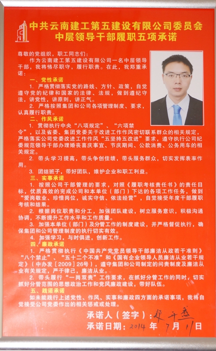 “尊敬的黨組織,職工同志們:作為云南建工第五建設(shè)有限公司一名中層領(lǐng)導(dǎo)干部,我將恪盡職守,履行職責(zé)。在此,我鄭重承諾:……”近日,公司中層以上領(lǐng)導(dǎo)干部均在各自辦公室醒目位置掛牌公示《中層領(lǐng)導(dǎo)干部履職五項(xiàng)承諾》。 早在今年5月初,為加強(qiáng)對(duì)中層干部的管理,強(qiáng)化監(jiān)督,落實(shí)責(zé)任,促進(jìn)干部履職。公司紀(jì)檢監(jiān)察部聯(lián)合黨委工作部制定《中層領(lǐng)...