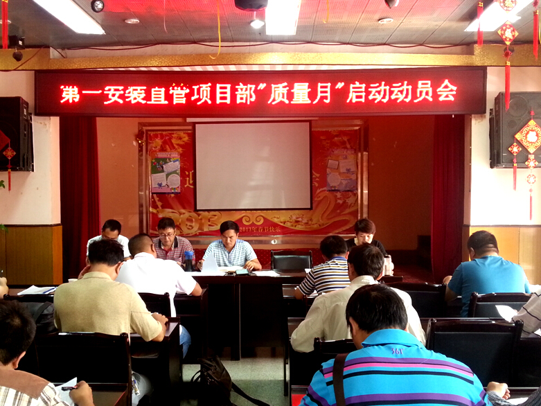 9月9日公司召開了“質(zhì)量月”啟動儀式后,9月10第一安裝直管項目部組織在昆明的項目經(jīng)理、技術負責人、綜合管理科等相關人員進行了2014年“質(zhì)量月”啟動動員會。 動員會上,直管部主要領導宣傳了住房城鄉(xiāng)建設部相關文件精神及公司“質(zhì)量月”啟動儀式上公司活動安排、公司領導對工程質(zhì)量管控的要求。直管部領導針對機電安裝質(zhì)量管控做了具體的安排及要求。制定了2...